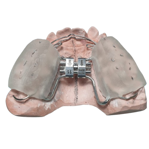 El Disyuntor McNamara es un aparato ortodóntico diseñado para realizar una expansión palatina rápida mientras influye positivamente en el desarrollo transversal del maxilar. Este dispositivo incluye una estructura acrílica y un tornillo central que facilita ajustes controlados durante el tratamiento.