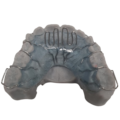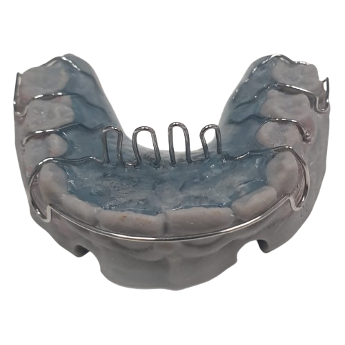 La Placa de Expansión con Rejilla Lingual es un aparato removible que combina dos funciones principales: expansión del maxilar y guía funcional de la lengua. Incluye un tornillo central para realizar ajustes expansivos y una rejilla metálica que limita el movimiento inadecuado de la lengua, favoreciendo su reposicionamiento correcto.